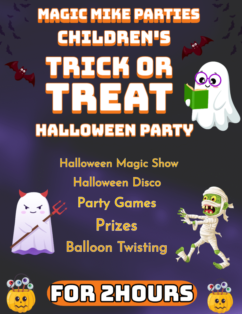 Book your Halloween Parties today with comedy magic show , a Spooky Disco with Lights and Party Games with Prizes